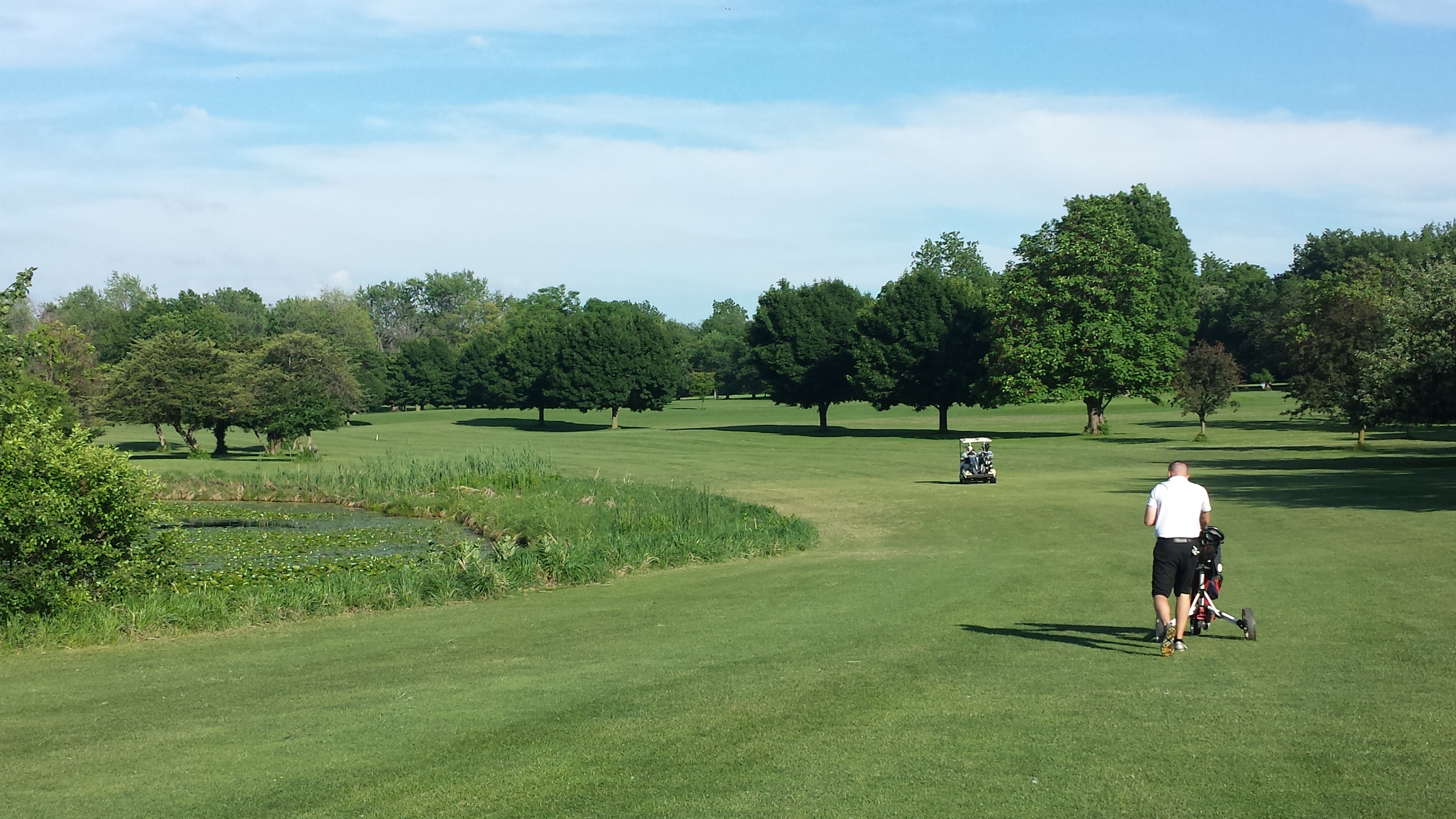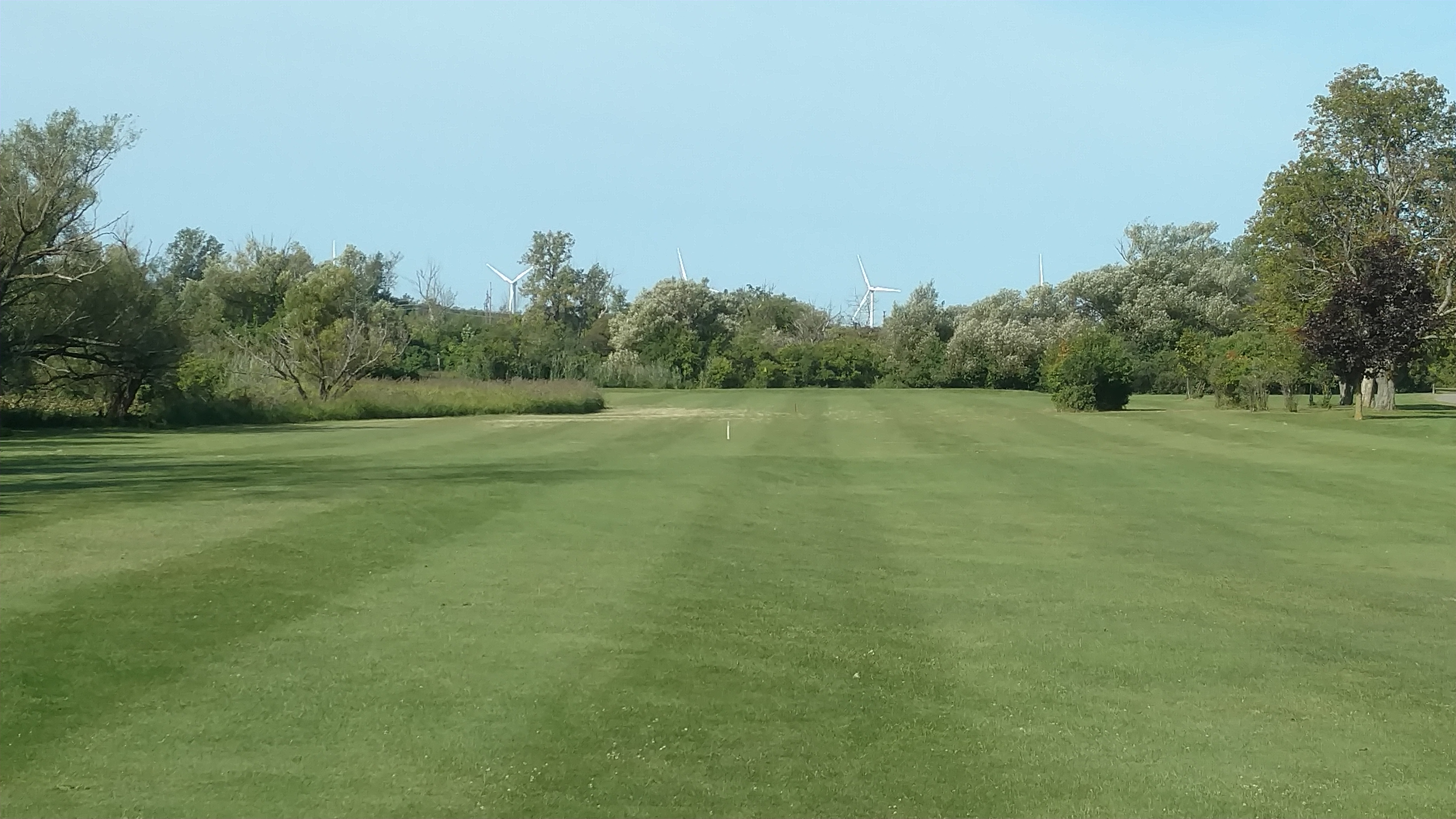 The Fifth Hole, seen from the fairway in the picture to the right, is the shortest par 4 on the course, measuring only 270 yards. However, with out-of-bounds down the entire right side and South Park Lake down the left, any score is possible.
