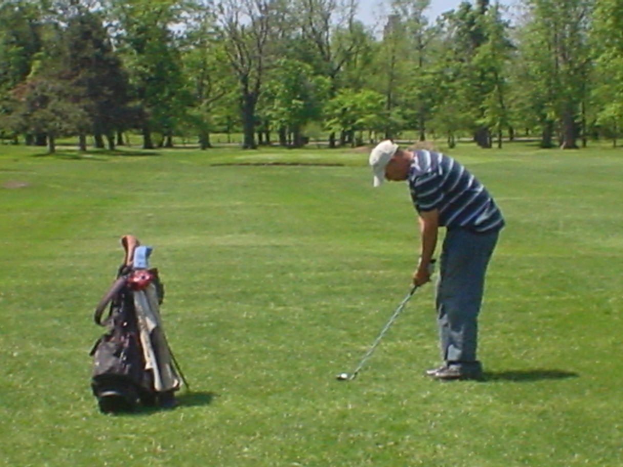 The 320 yard second hole, seen from the fairway in the picture to the left of our late friend Darin Tesmer, the 2007 B Class champion who died in a tragic motorcycle accident in 2008, has remained the same yardage since its design, but has recently seen the installation of three bunkers: a bunker guarding each side of the fairway, and another guarding the front left of the green.