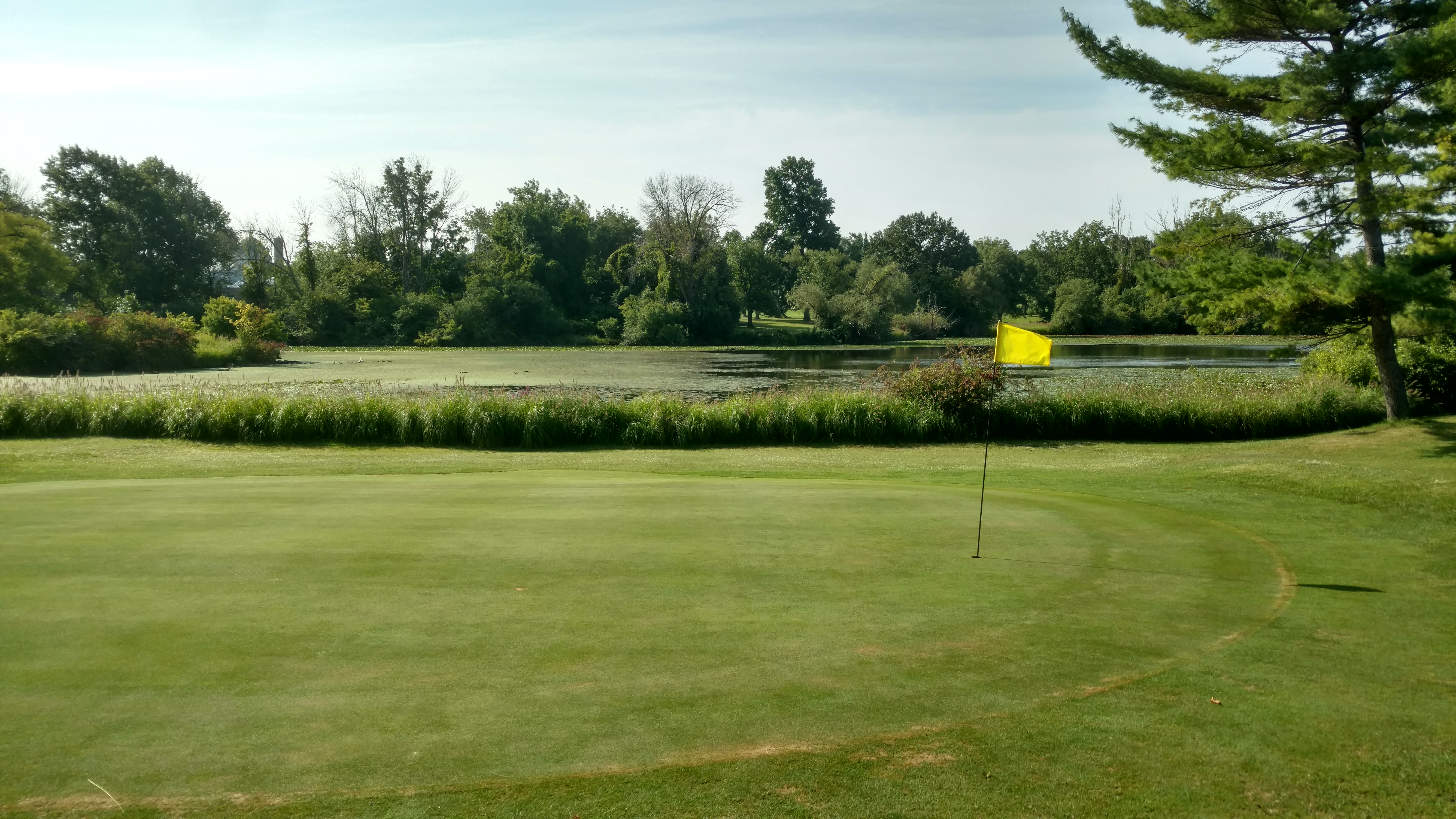 The green is bordered by a 1-2 foot high grass bunker on all sides but the front; however, there is no bail out long as anything 15 feet over the green is out-of-bounds. The right of the green is protected by a large elm tree that partially blocks the tee shot from the shorter 100 yard ladies tee.