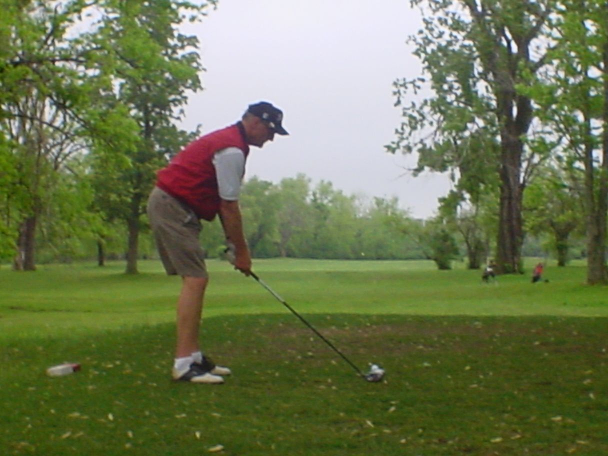 The third hole measures between 333 yards from the front of the men's tee to 355 in the rear. What the third hole lacks in length it more that makes up for in accuracy. As shown from the picture of 2008 Club President Mike Ciesla to the right taken from behind the tee, a player must thread his tee ball through a 20 yard wide chute of trees for the first 175 yards. Many tee shots catch the very tall tree that guards the end of the chute on the right side.